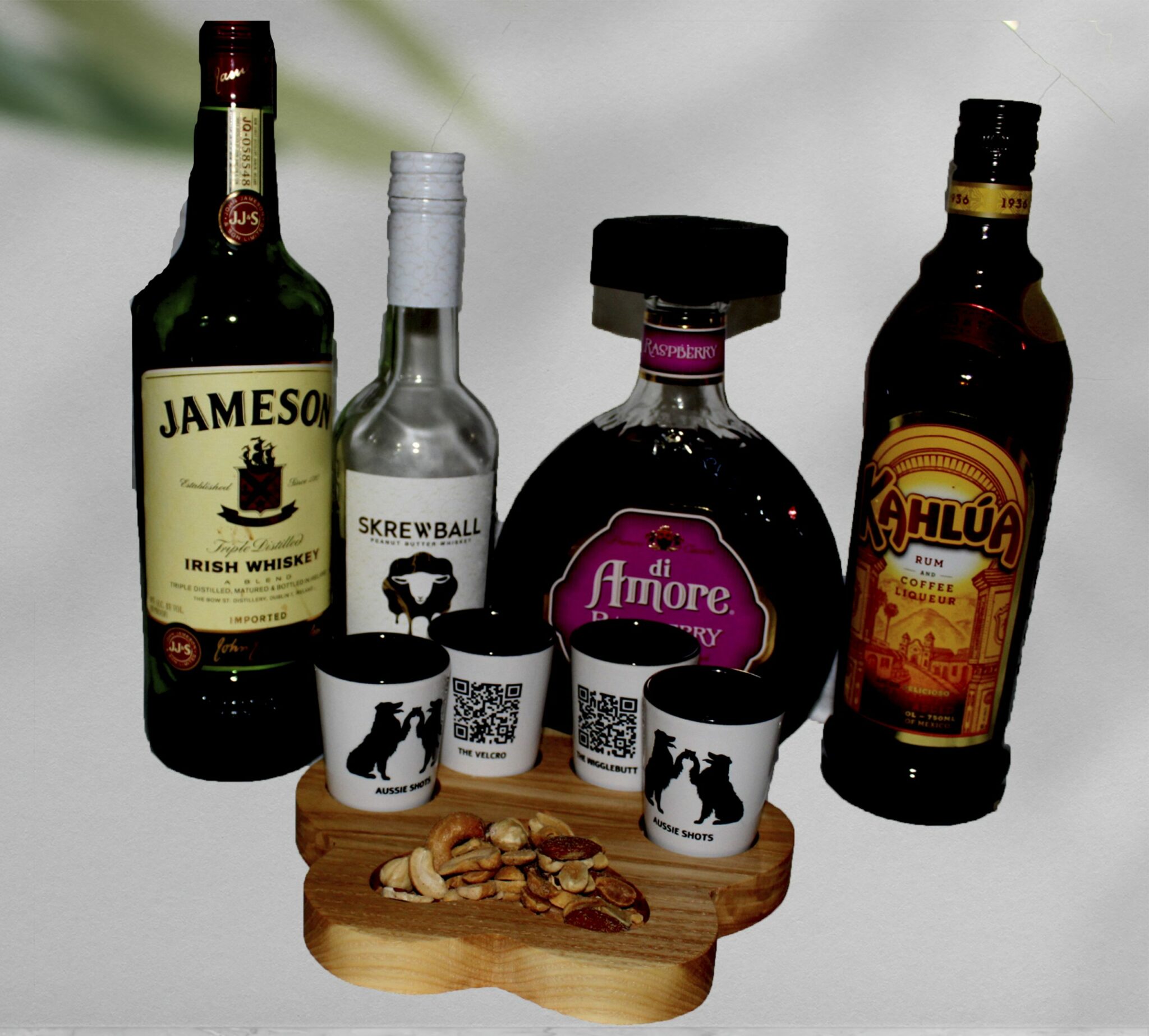 Aussie Shots – Paw Print Shot Glass Tray. Celebrating the many personalities of the Aussie, this beautiful paw print is hand made from the finest ash wood and includes 4 Aussie themed shot glasses with a space for condiments or snacks. Each shot glass represents a different Aussie trait. Shots include the Sploot, the Velcro, the Wigglebutt and the Ausshole. Scan the QR code on the shot glass, with your phone, for a link to the recipe for each individual shot or make up your own.