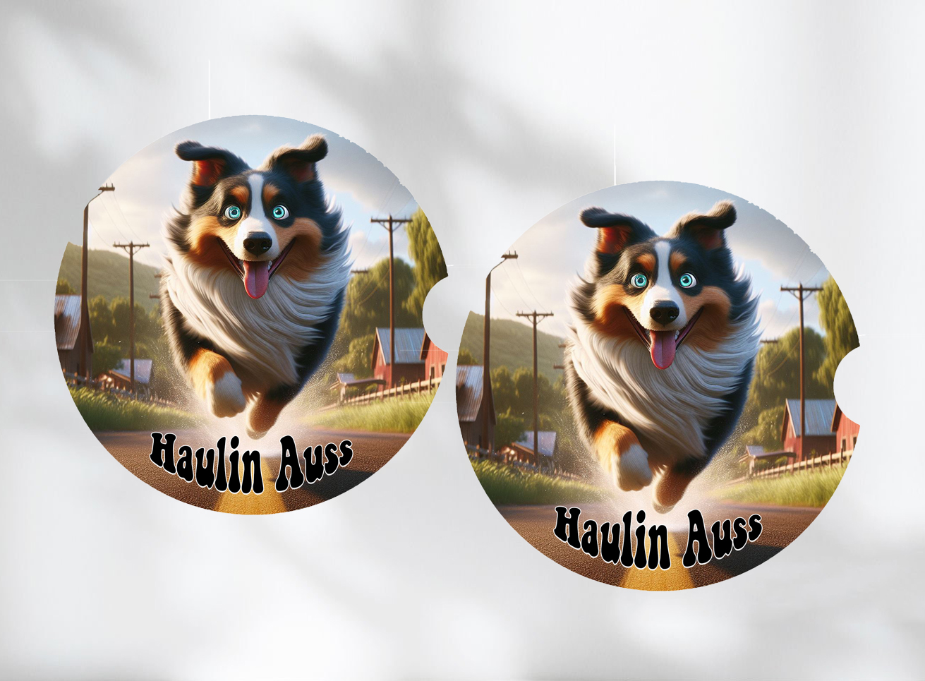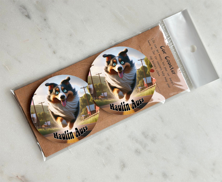 This adorable car coaster set (qty 2) celebrates your co-pilot and the energy that he or she brings. Haulin Auss because what else would they be doing? Our fabulous car coasters keep your cup holders from getting damp and dirty. The coasters measure 2.56 in diameter and fit most standard cup holders. Both the neoprene and the sandstone absorb moisture and won’t  fade or deteriorate over time.