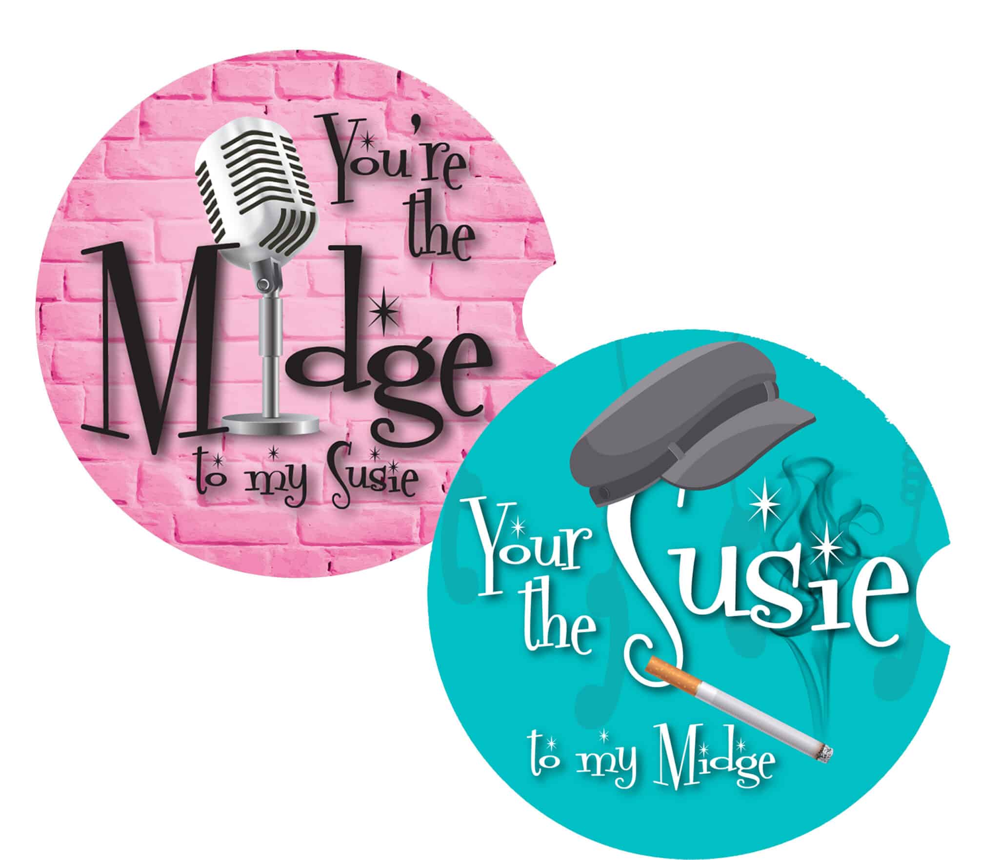 Midge and Susie neoprene car coasters. You loved the show, now add this great car accessory to your vehicle. Keep your car cup holders clean with these great waterproof coasters. We all have best friends tell your that you really care with this unique set. Not available anywhere else. Set of 2.