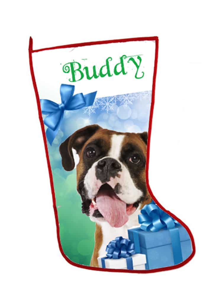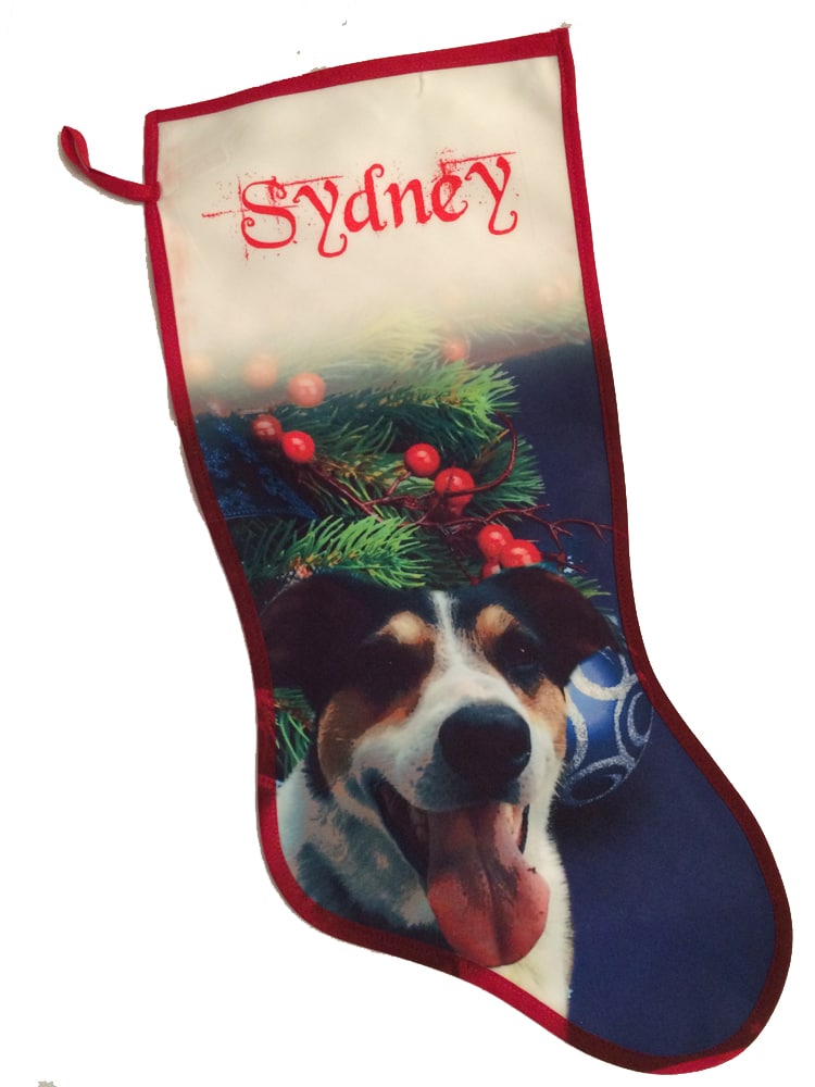 Personalized Pet Holiday Stocking. Create a unique holiday gift for your fur family member by using your own photo and one of our backgrounds you can truly design a one of a kind holiday stocking. Your pet’s name will be inserted above the image in the font color of your choice.