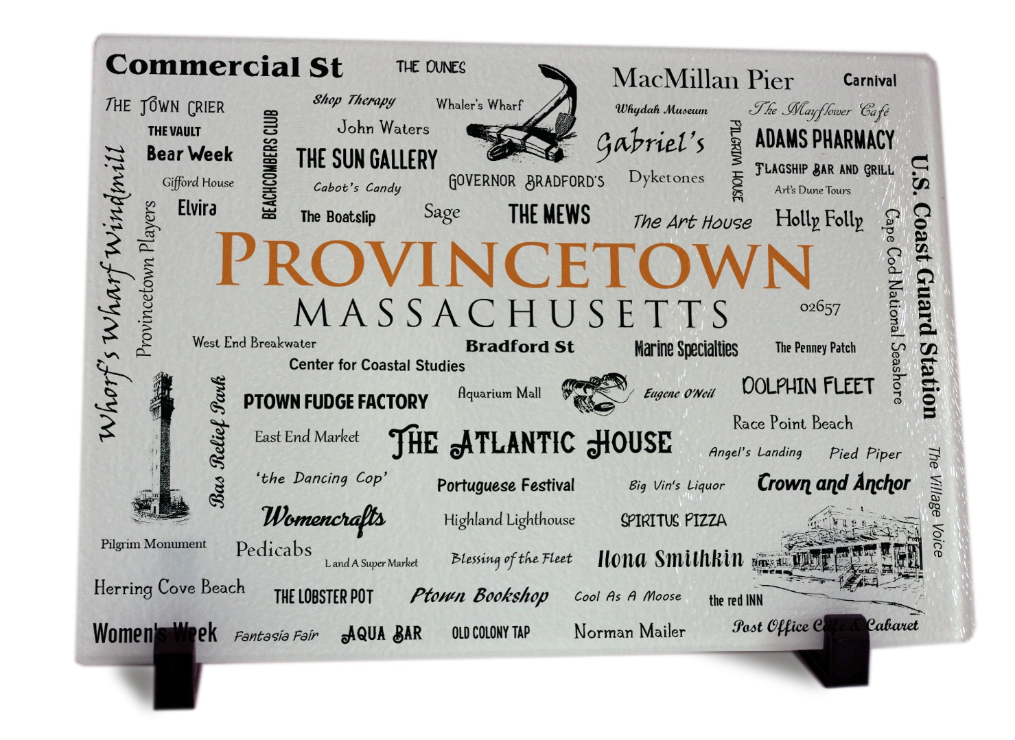 Provincetown MA Word Art Cutting Board, celebrate your home town with our word art cutting boards. Tempered glass. Rectangle, 11.1″ x 7.9″ x .15″, Textured Chinchilla Finish, with rounded corners. Great for in home kitchens as well as restaurants. Use as a cutting board or a memorable display piece. Dishwasher Safe, for maximum life of the imaged product, we recommend hand washing. With rubber self adhesive feet. Display stand/feet sold separately here.